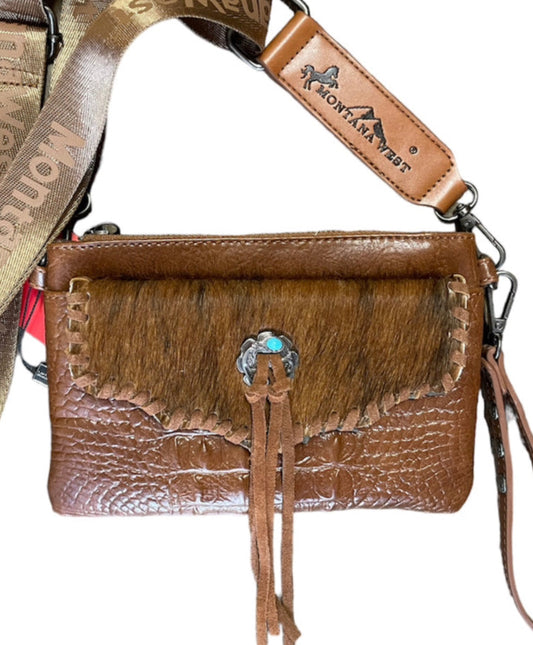 MW1268181BR - Montana West Hair-On Cowhide Croc Embossed Clutch/Crossbody