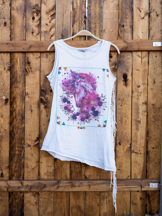 DLT024 - Mineral Wash Hand Stitching Floral Horse Graphic Tassel Sleeveless Tee