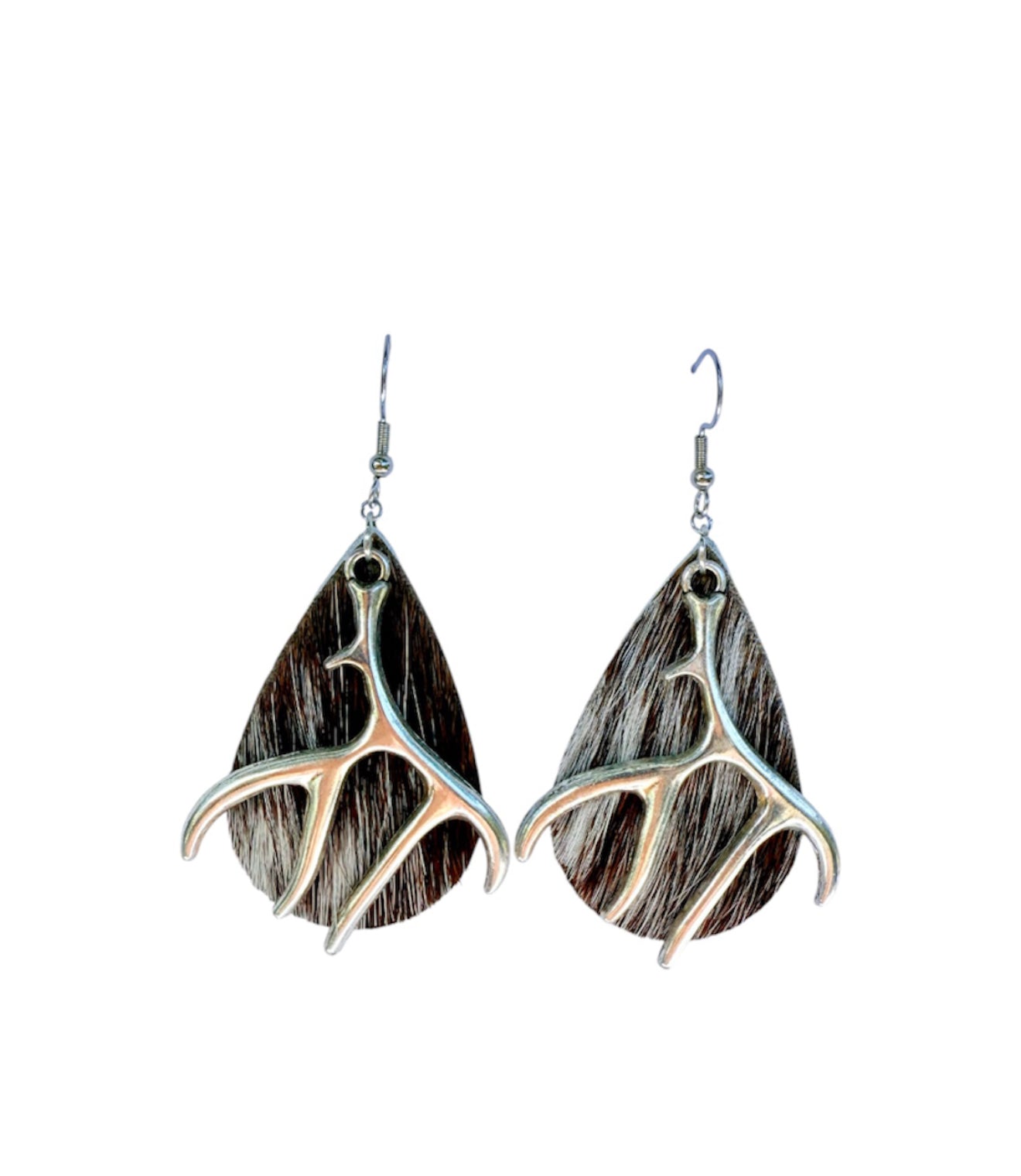 100% Hair on Hide Tear Drop Earrings with 5 Point Antlers